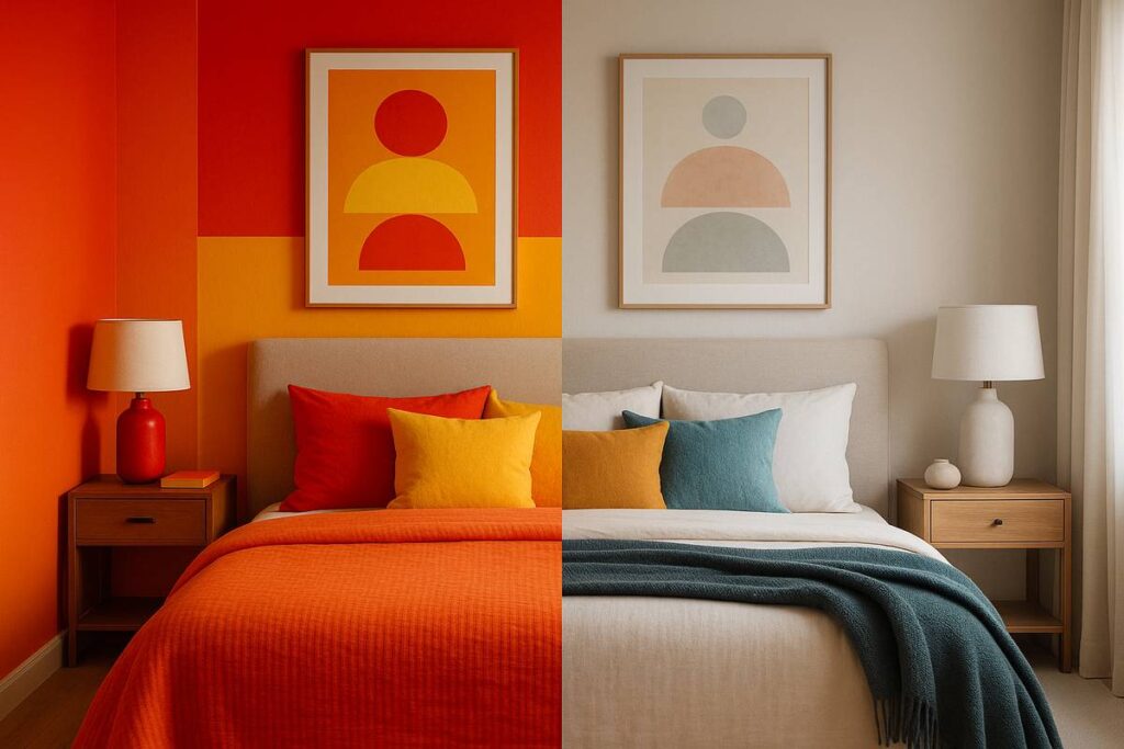 O quarto é um espaço de descanso, e cores vibrantes em excesso (como vermelho, laranja vivo ou amarelo forte) podem estimular demais e atrapalhar o sono. O ideal é manter uma base neutra e usar tons mais vivos em detalhes, como almofadas ou mantas.