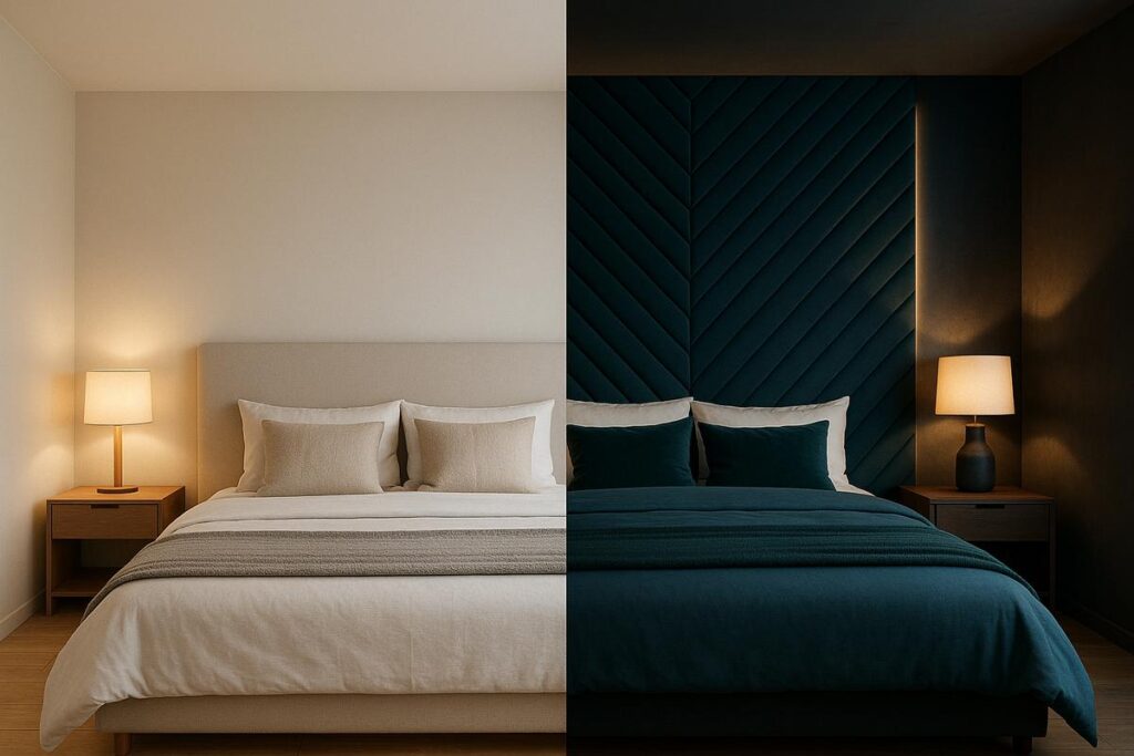 A altura da cabeceira também influencia diretamente no resultado visual. Cabeceiras muito baixas podem desaparecer atrás de almofadas e travesseiros, enquanto modelos muito altos podem “encurtar” visualmente a parede.