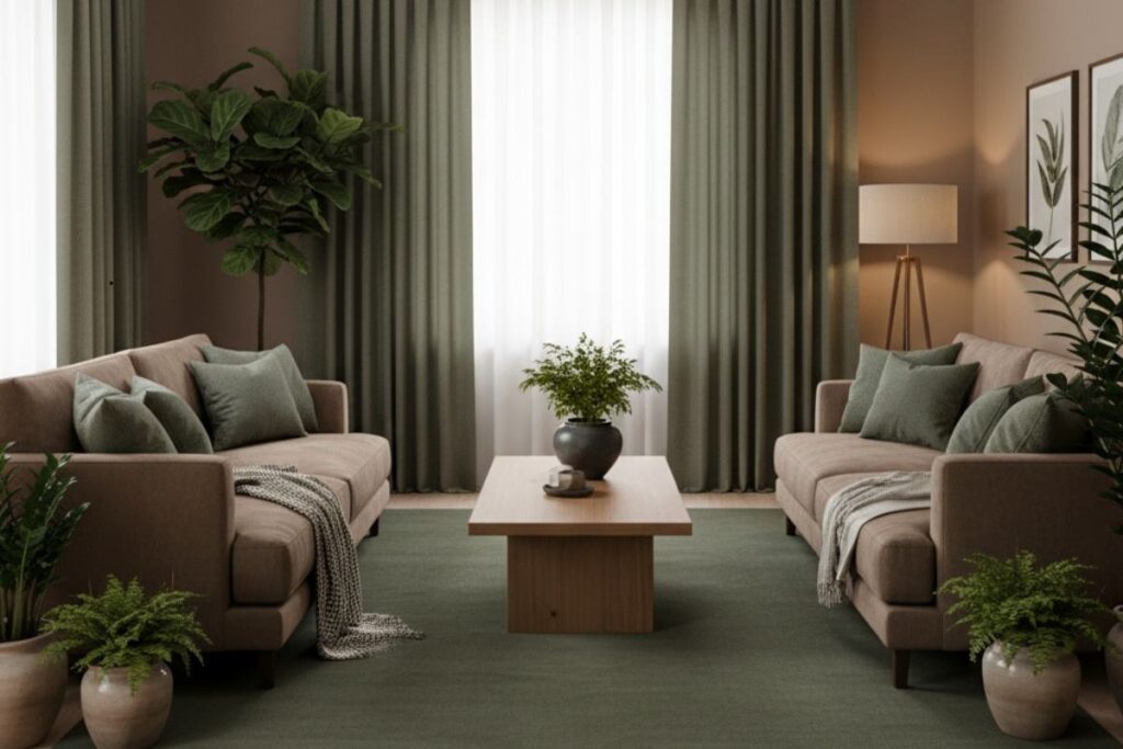 Sala elegante em tons de verde e marrom