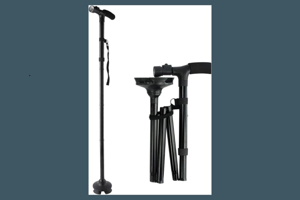 Bengala com assentoIdosos que precisam descansar durante caminhadas ou filasFunção dupla: assento e apoio; útil em espaços públicosPeso maior; não é prática para todos os trechosAlumínio e aço