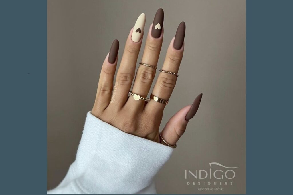Unha em gel marrom com desenho de coração – Foto: indigo designers