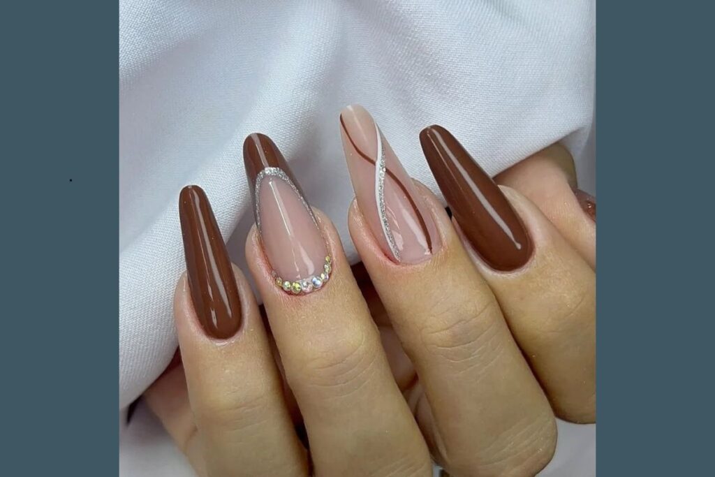 Para quem quer um visual glamouroso, essa ideia mistura o marrom com linhas prateadas e pequenas pedrarias. A composição é equilibrada, sem perder a elegância.