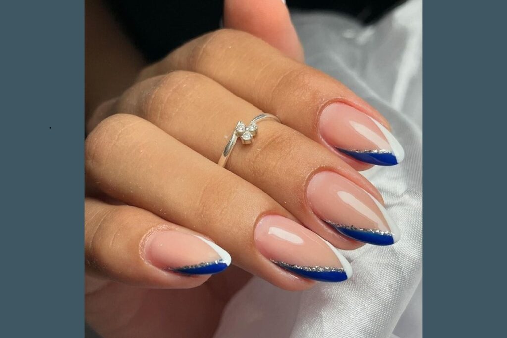 Essa é uma versão moderna da clássica francesinha. O toque azul na ponta, com detalhes em prata e branco, traz personalidade e estilo. O fundo translúcido mantém o visual equilibrado, tornando essa ideia perfeita para quem gosta de inovar.