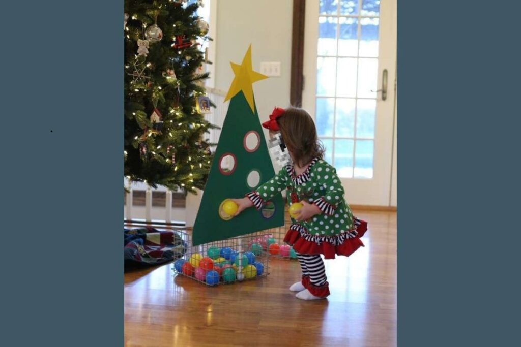 Aqui, a criança encaixa bolas coloridas nos recortes da árvore de papelão grande. É uma excelente oportunidade para trabalhar a noção de espaço, cores e movimento de pinça adaptado. Além disso, é uma brincadeira dinâmica que pode ser repetida várias vezes.