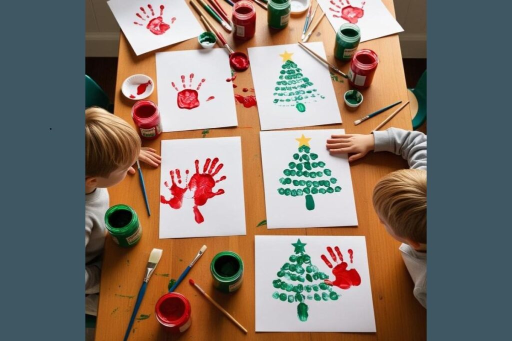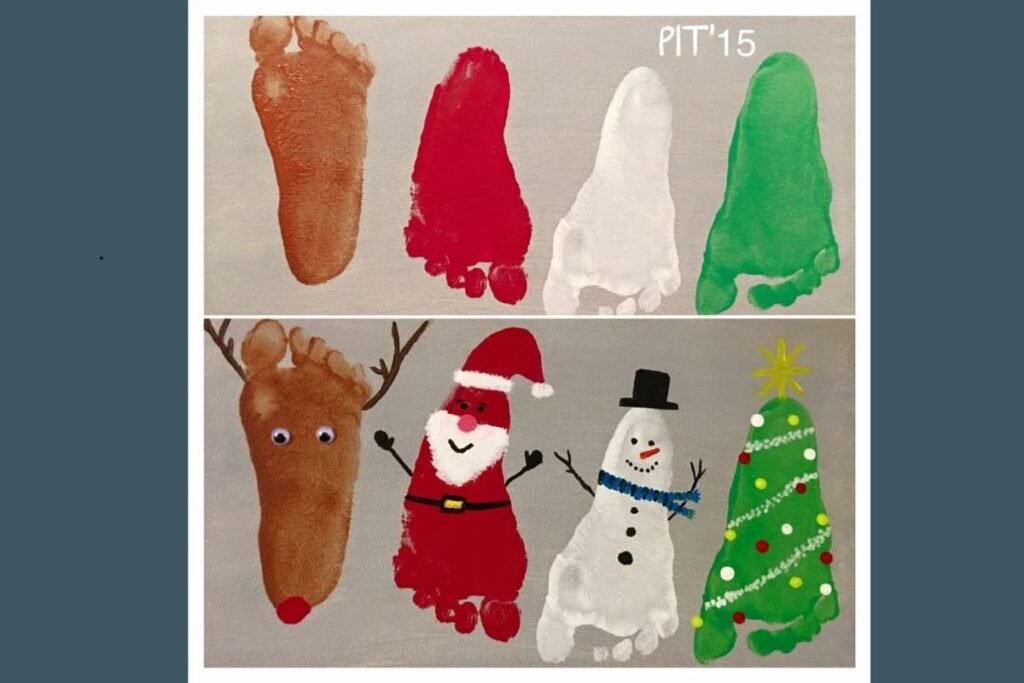 As pegadas viram rena, Papai Noel, boneco de neve ou árvore. O bebê apenas mergulha o pé na tinta e o adulto apoia na folha. Depois, os detalhes são adicionados pelo educador. A ideia gera lembranças afetivas e registros especiais dessa fase.