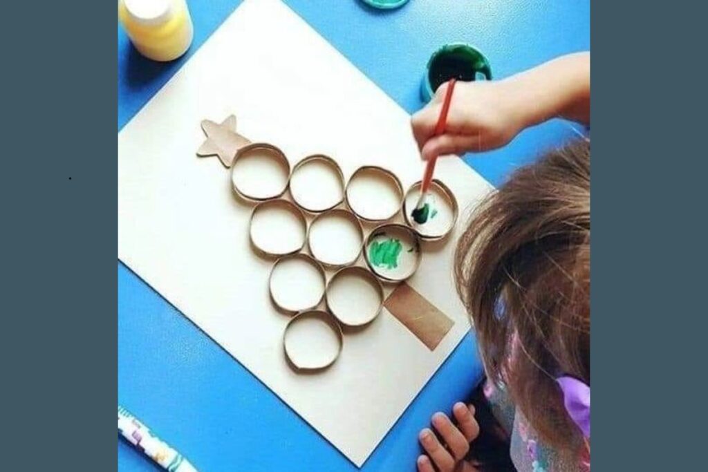 Os rolinhos de papel higiênico cortados criam pequenos círculos que montam o formato de árvore. O bebê pinta dentro de cada círculo com pincel grosso ou esponja. A estrutura ajuda no controle do movimento, permitindo que mesmo os menores participem.