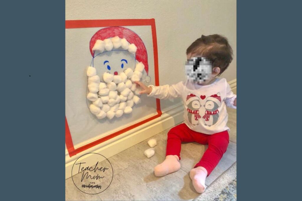 Essa é uma das atividades sensoriais favoritas. O bebê cola bolinhas de algodão no rosto do Papai Noel desenhado.