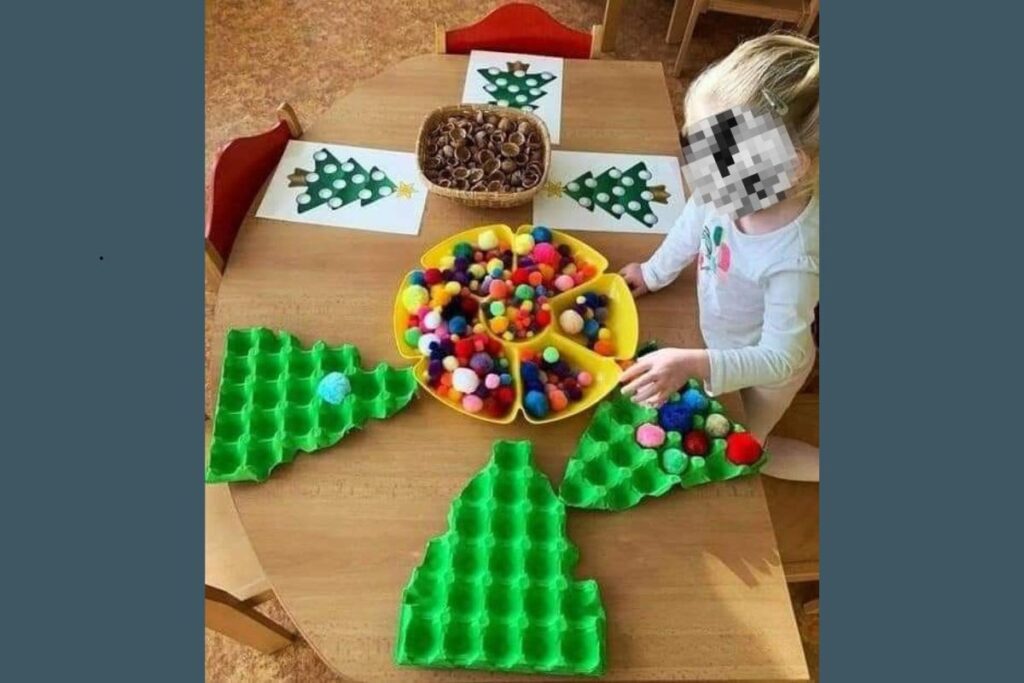 Com bandejas, caixas de ovos ou moldes em formato de árvore, os bebês colocam pompons grandes nos espaços.