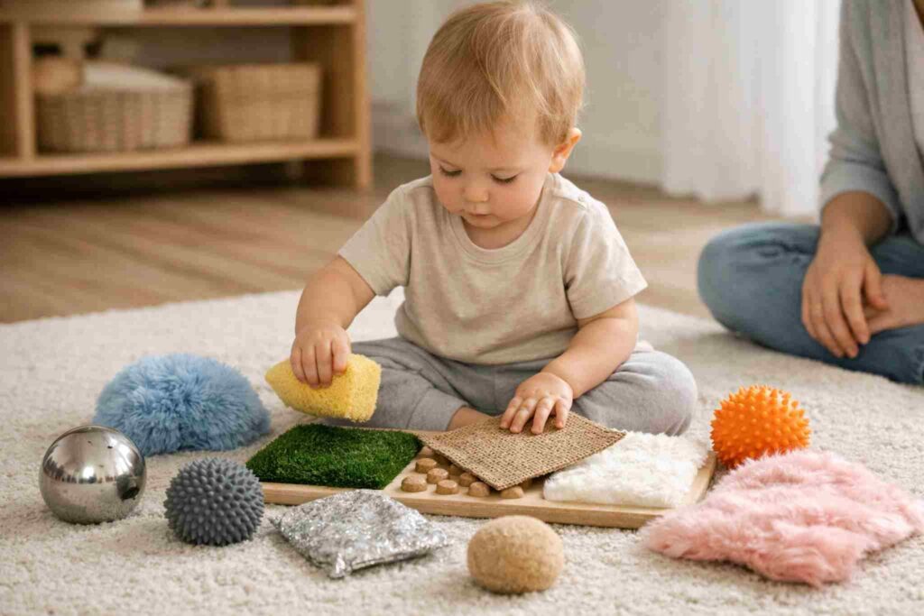 Como fazer: reúna tecidos, esponjas, bolas ou objetos com diferentes texturas e deixe a criança tocar e manipular livremente.