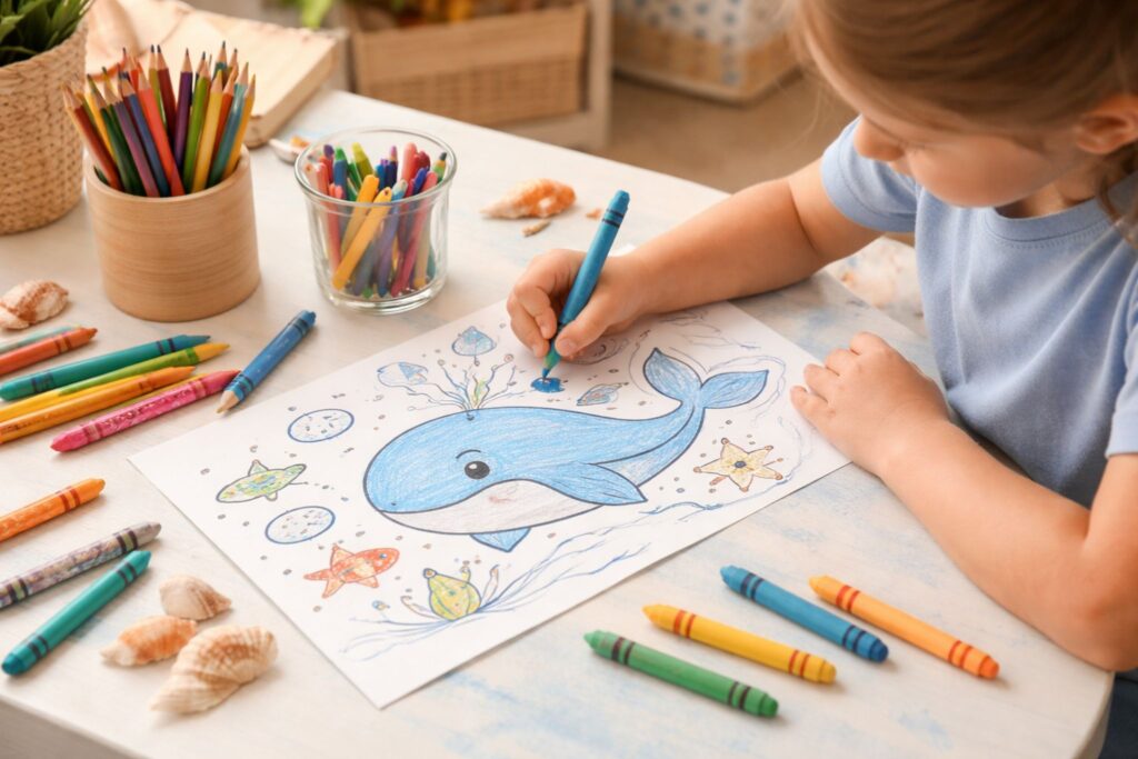 Um espaço calmo, com boa iluminação e sem pressa ajuda a criança a se concentrar melhor. Esse cuidado transforma o desenho de baleia para colorir em um momento de relaxamento e diversão.