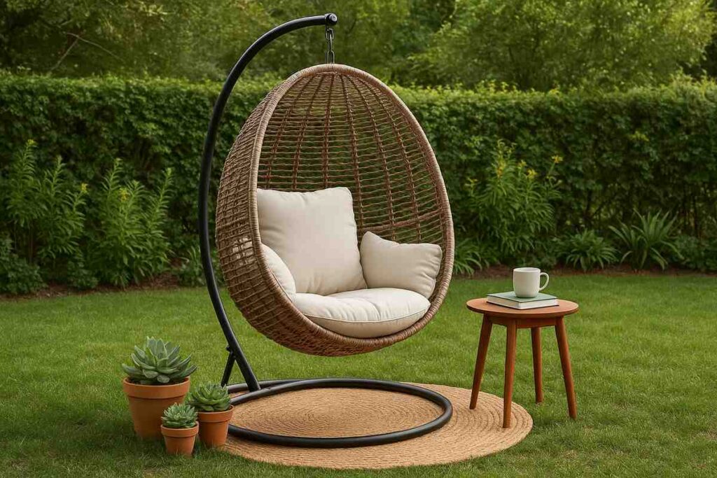 Esse tipo de banco virou tendência nos últimos anos. Com formato oval, estrutura em aço ou alumínio, e revestimento em rattan sintético, a “egg chair” é extremamente confortável, moderna e versátil. Muitos modelos contam com suporte próprio para pendurar, o que facilita a instalação.