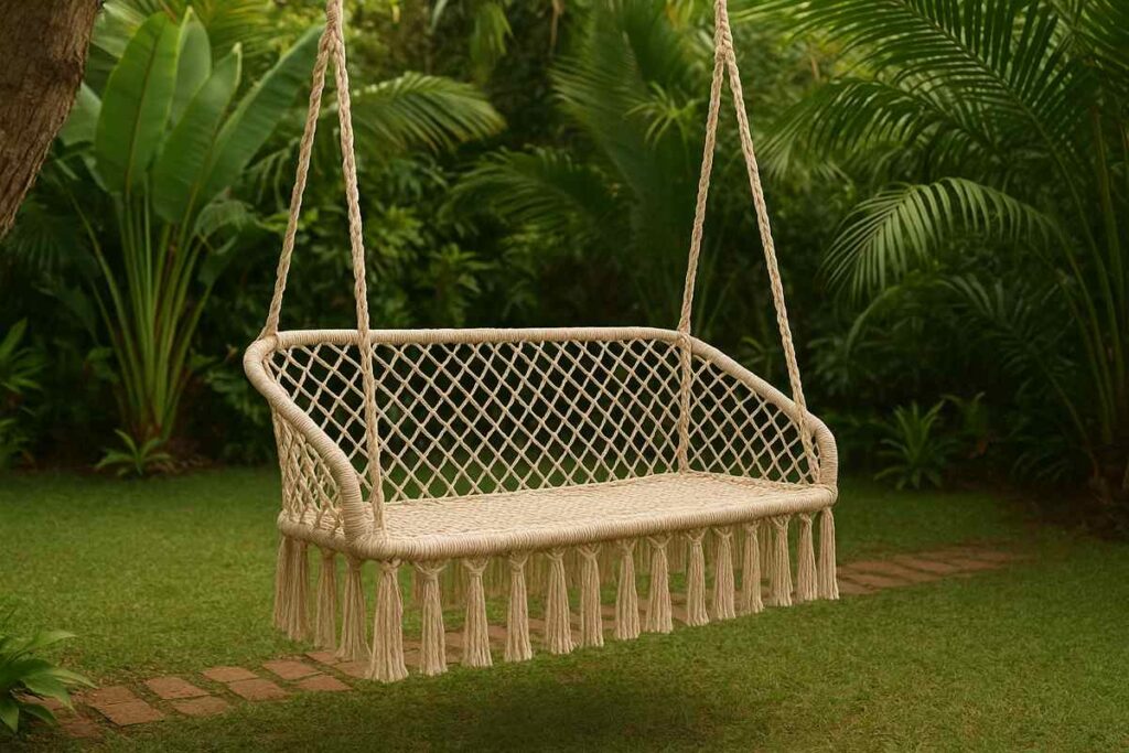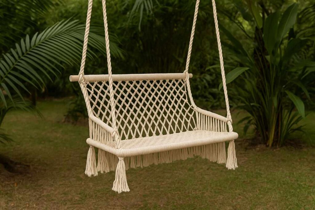 Esses bancos são pendurados em árvores ou estruturas de pergolado. São leves, descontraídos e muito confortáveis, especialmente em jardins tropicais, boho ou praianos. É essencial garantir uma boa fixação para segurança.