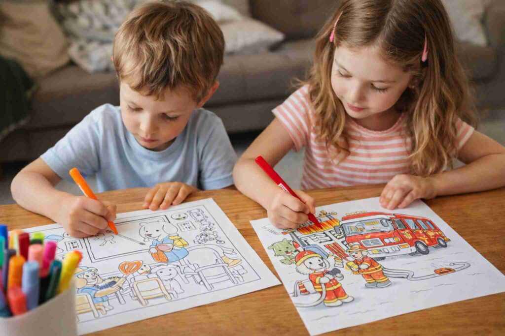 Quando a criança pinta um personagem exercendo uma profissão, ela passa a observar detalhes, funções e ambientes. Isso estimula a curiosidade e abre espaço para diálogos importantes.