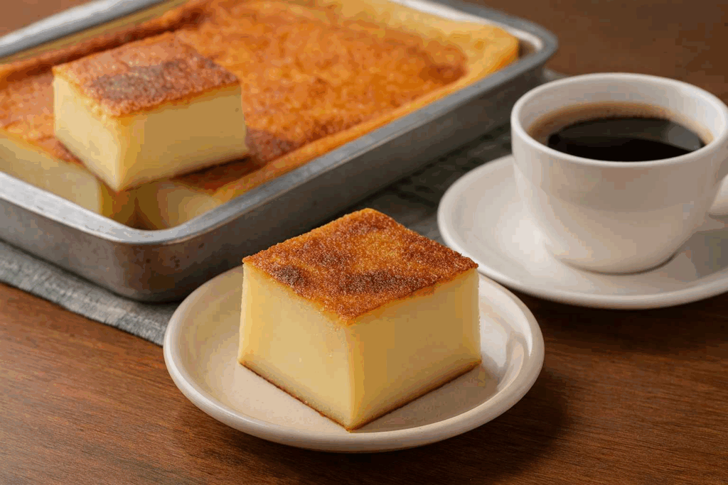 Depois de retirar do forno, espere esfriar antes de desenformar. O bolo fica com uma consistência que lembra uma queijadinha ou pudim firme, levemente molhadinho e incrivelmente saboroso.