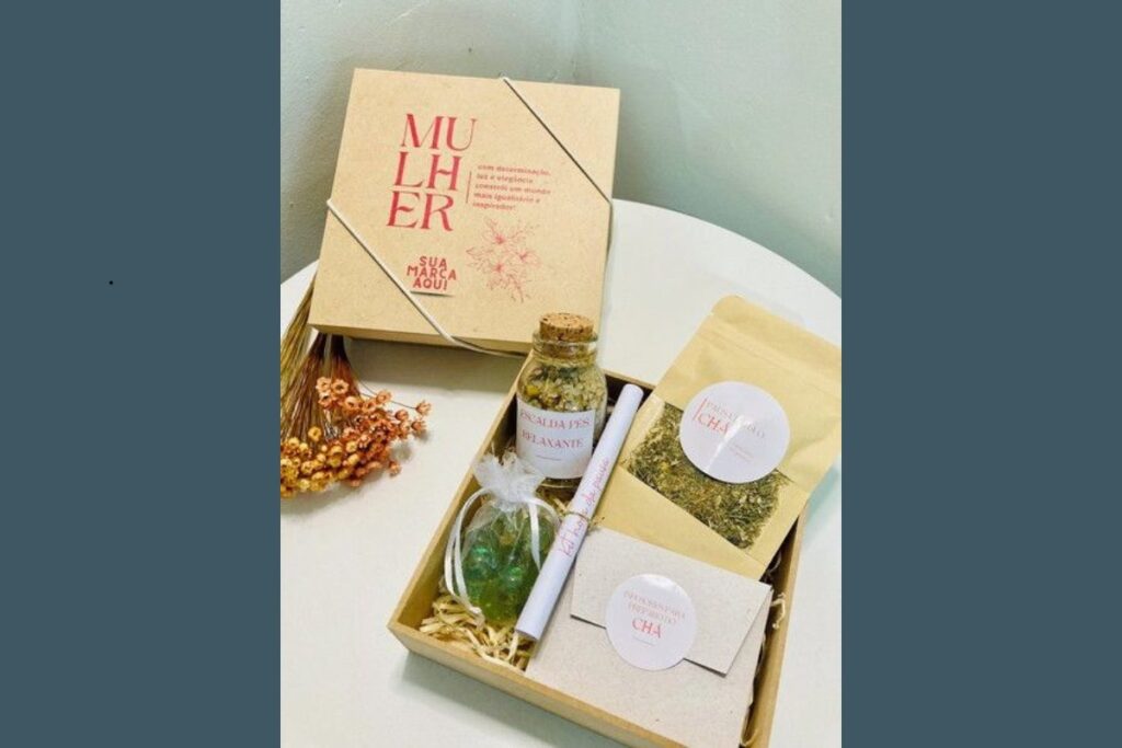 Esse tipo de brinde transmite autocuidado e relaxamento. A combinação de sais de banho, vela aromática e sabonete artesanal cria uma experiência sensorial.
