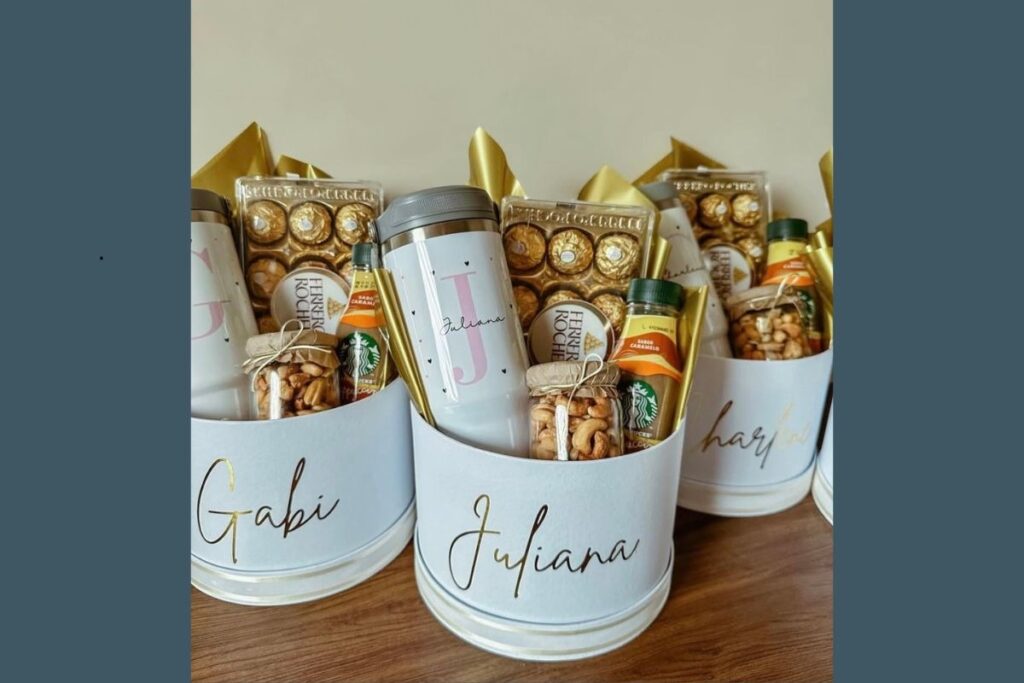 Caixa ou lata personalizada com chocolates premium, café especial e itens personalizados com nome. Combina carinho e exclusividade.