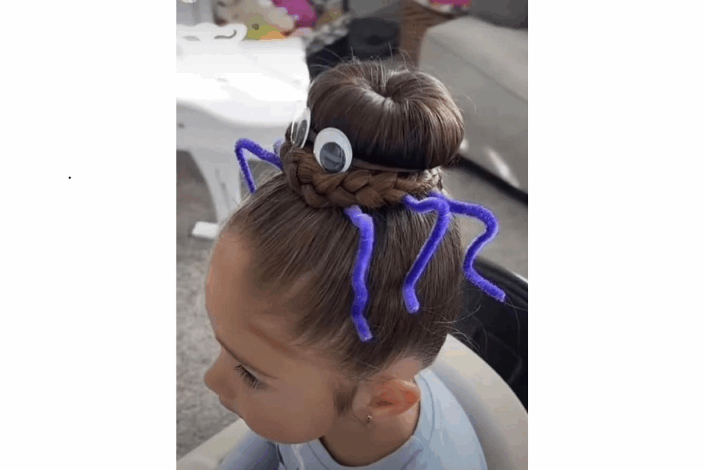 Aqui o coque é transformado em uma aranha estilizada, com trança na base e olhinhos colados. Os limpadores de cachimbo roxos viram pernas, deixando o visual divertido e chamativo.