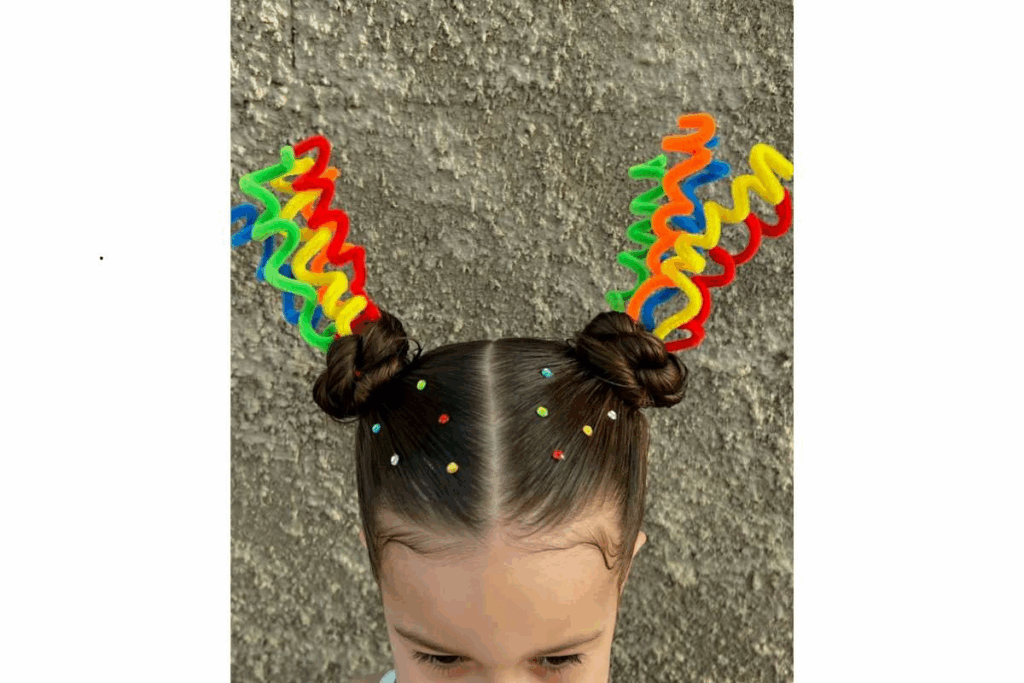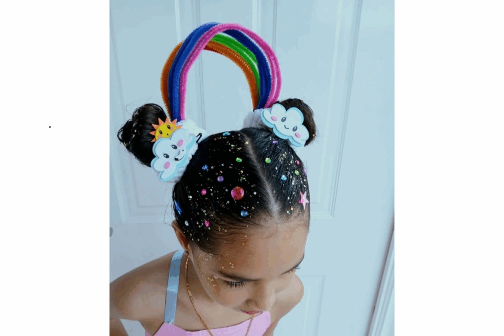 Nesse penteado, os coques laterais são unidos por limpadores de cachimbo coloridos, formando um arco-íris. Estrelas, glitter e detalhes brilhosos completam a produção divertida.