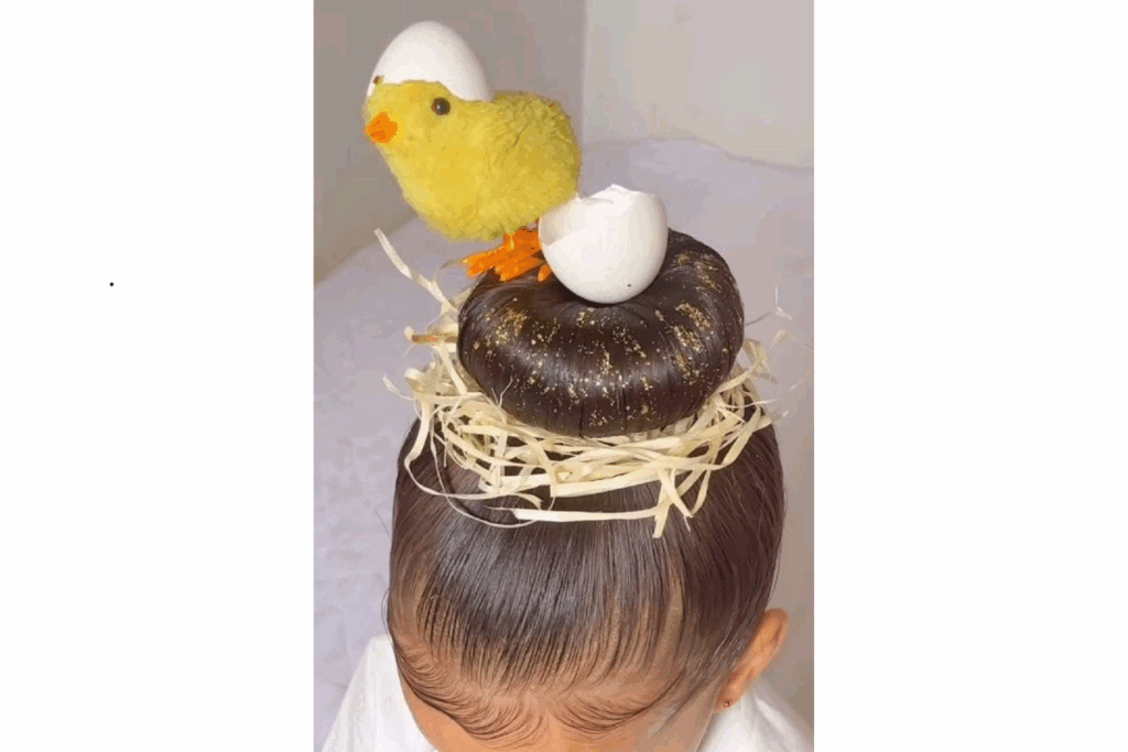 Um coque arredondado vira um ninho, com palha decorativa e um pintinho saindo do ovo. É uma ideia encantadora que chama atenção pela riqueza de detalhes.