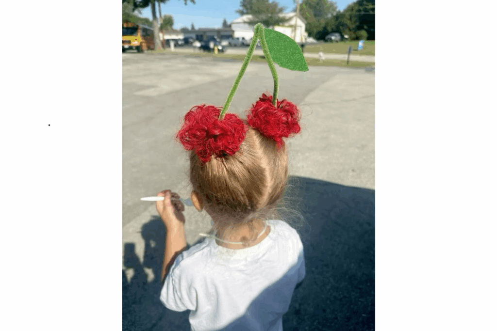 Nesse estilo, dois coques vermelhos são transformados em cerejas com a ajuda de folhinhas e hastes verdes. O resultado é alegre e combina bem com festas escolares.