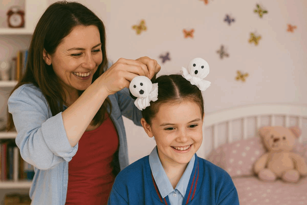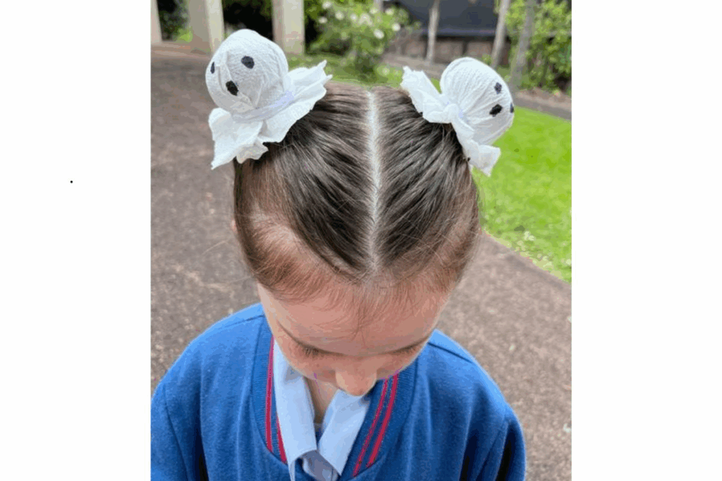 Esse penteado usa dois coques pequenos no alto da cabeça, decorados com tecidos brancos formando fantasminhas. É uma ideia simples e muito criativa, perfeita para eventos escolares próximos ao Halloween.