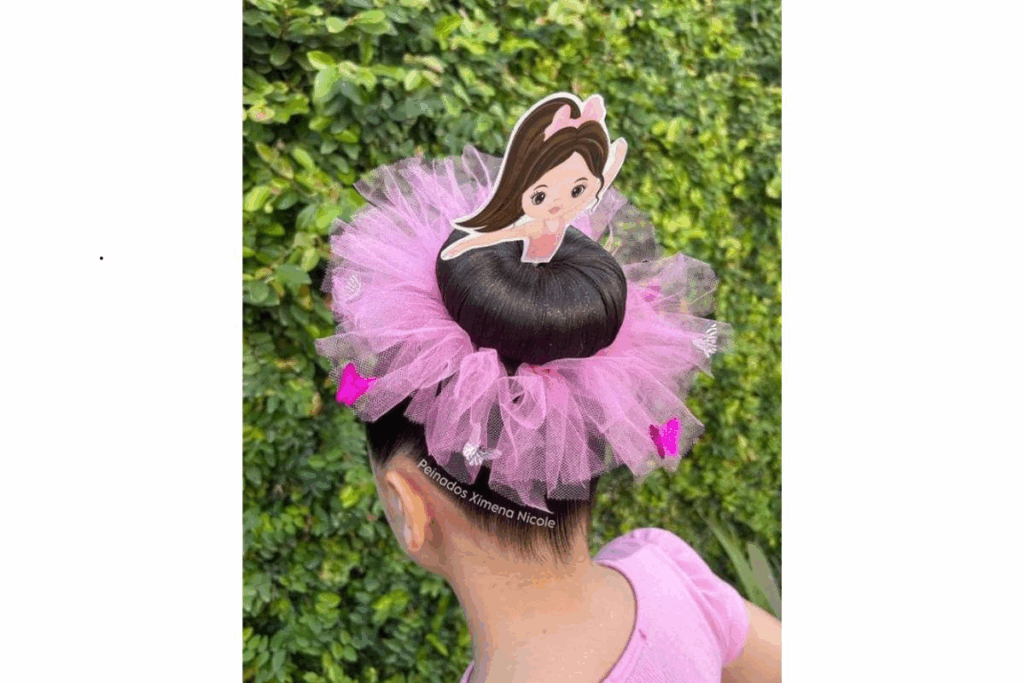 O coque tradicional é decorado com tule rosa e um enfeite de bailarina no topo. Esse penteado mistura criatividade e delicadeza, ideal para meninas que amam dança.