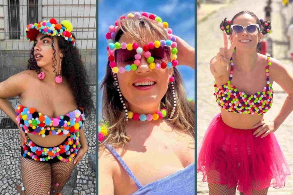 Os pompons aparecem aplicados em tops, saias, sutiãs e acessórios de cabeça. Eles trazem volume, movimento e uma estética divertida que funciona bem em looks minimalistas ou ousados. Quanto mais cores misturadas, maior o impacto visual.