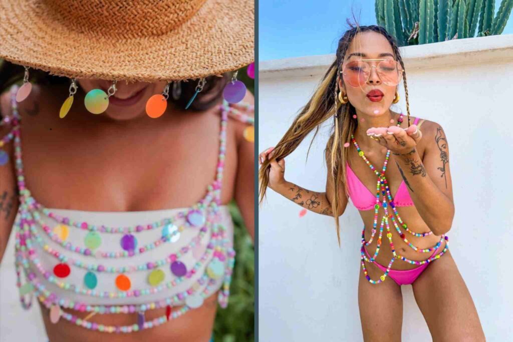 As miçangas voltam com força total no Carnaval e moda 2026. Elas surgem em colares múltiplos, tops artesanais, franjas e óculos customizados. A mistura de tamanhos e cores cria um visual vibrante e com forte apelo manual.