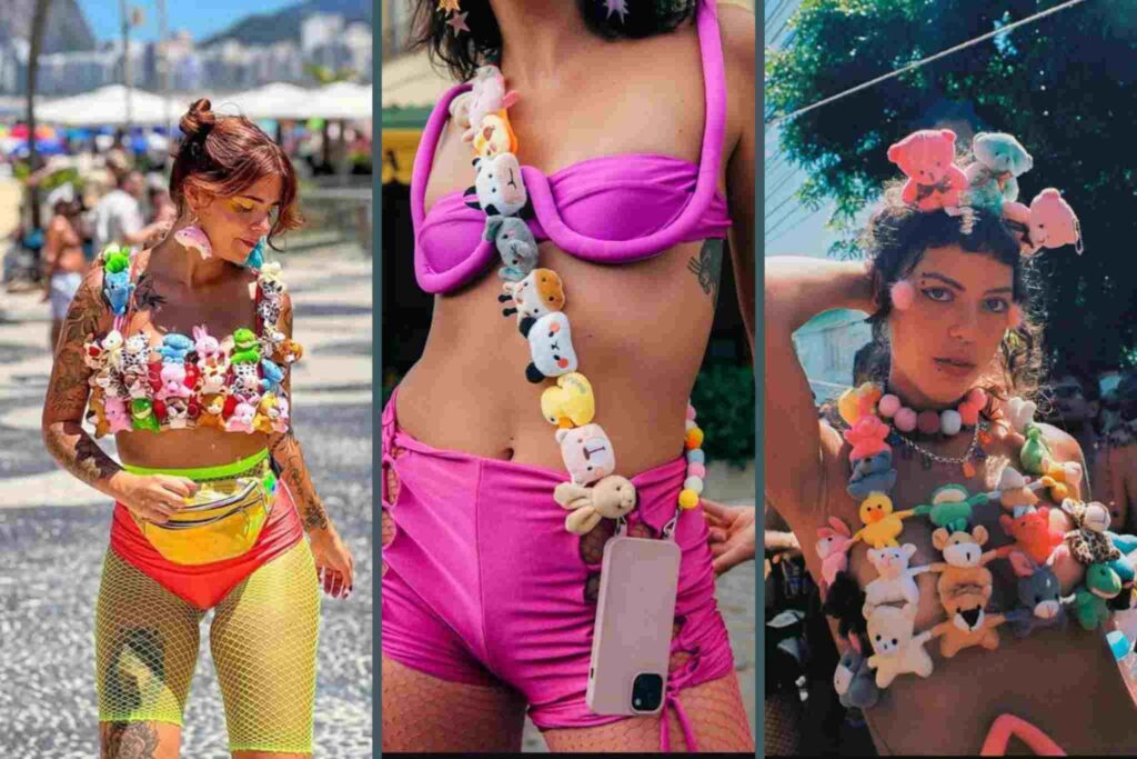 As mini pelúcias são uma das tendências mais comentadas do ano. Aplicadas em colares, tops e acessórios, criam um contraste divertido com o corpo e a proposta sensual do Carnaval. A estética lúdica e nostálgica explica o sucesso.