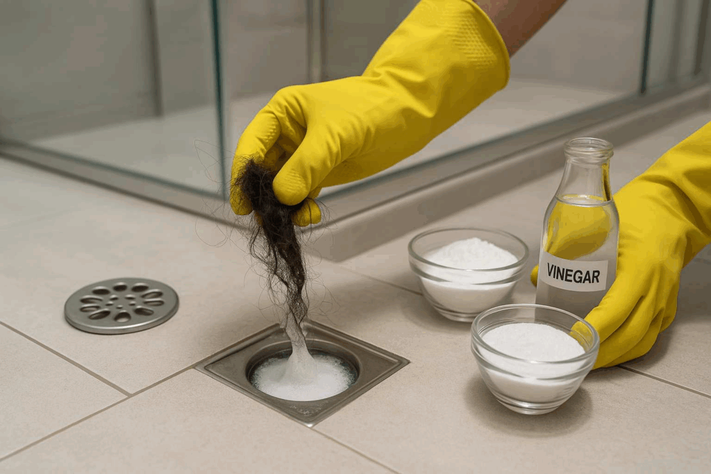 - Retire a tampa do ralo e remova cabelos e resíduos acumulados.