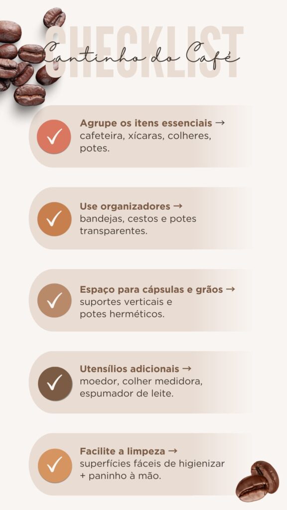Com planejamento, é possível adaptar a ideia a qualquer tamanho de cozinha e estilo de decoração, tornando o preparo do café uma experiência ainda mais especial.