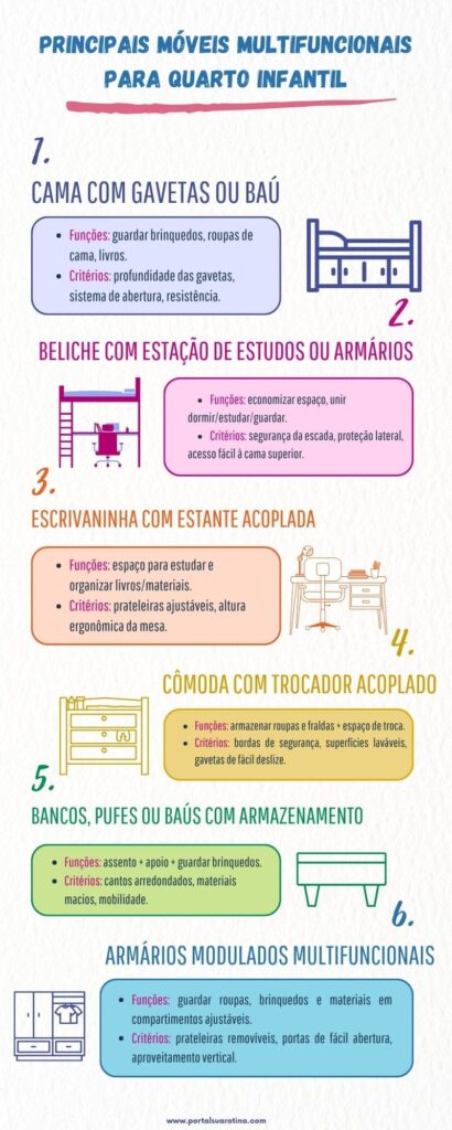 Abaixo estão os principais tipos de móveis multifuncionais para quarto infantil e os critérios para escolher o ideal em cada categoria.