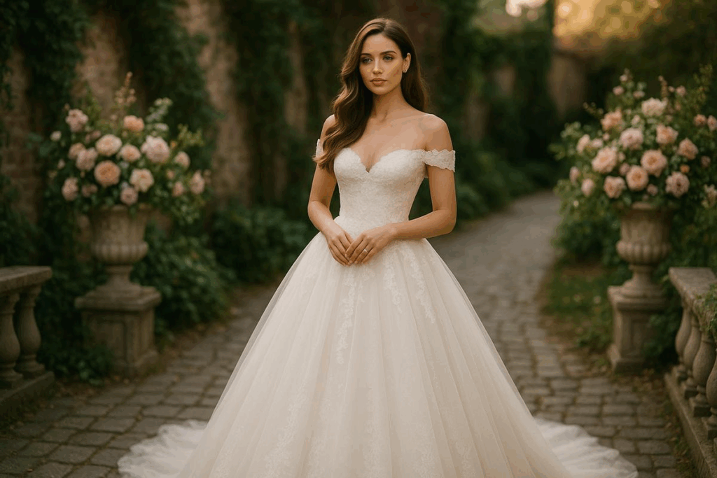 Esse é o modelo mais conhecido, com saia volumosa em camadas de tule, cintura bem marcada e corpete estruturado. Ele transmite tradição e elegância, sendo ideal para casamentos em igrejas ou cerimônias mais formais.