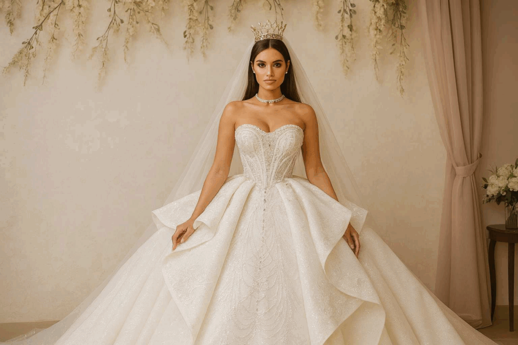 O vestido de noiva estilo princesa é um dos modelos mais tradicionais e desejados, conhecido por sua imponência e ar de conto de fadas.