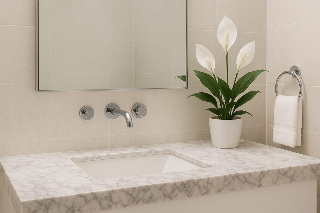 • Exemplo prático: um banheiro com bancada de mármore e um pequeno vaso de lírio-da-paz artificial ao lado do espelho. O branco das flores contrasta com a pedra e transmite sensação de limpeza.