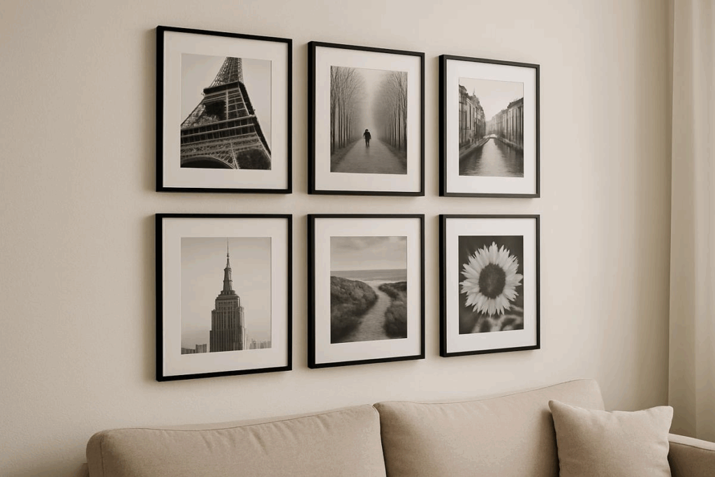 Antes de pendurar as imagens, é fundamental planejar a disposição. A grade simétrica é ideal para quem prefere organização e harmonia, com fotos do mesmo tamanho alinhadas em linhas retas, proporcionando um visual limpo e sofisticado, que combina com salas modernas ou minimalistas.