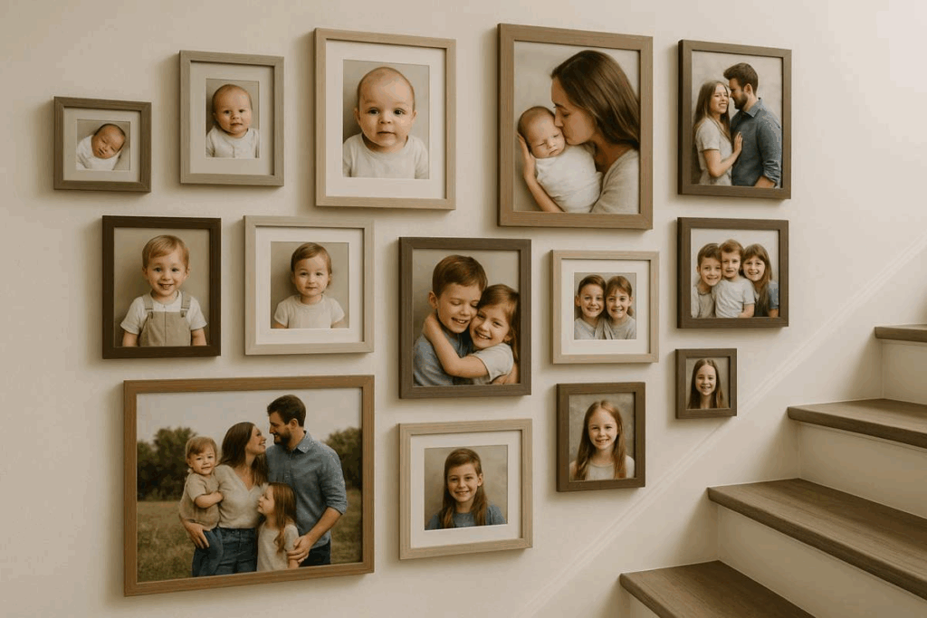 Esse estilo é perfeito para corredores, salas e quartos, permitindo que cada foto conte uma história e transforme o espaço em um lugar que reflita afeto e memórias queridas.