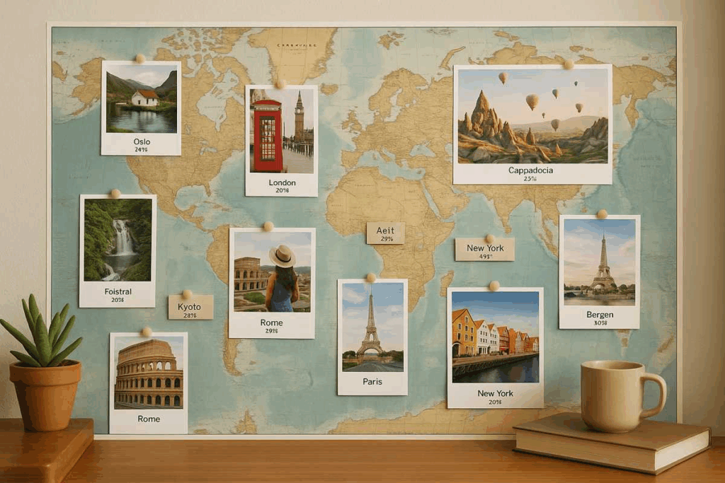 Transforme um espaço da sala ou do home office em um mural de viagens. Use um mapa-múndi como fundo e fixe fotos dos lugares visitados, criando uma narrativa visual dos destinos explorados.