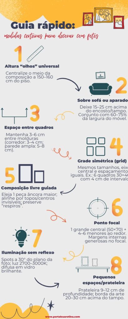 O segredo está em planejar bem a disposição, escolher molduras adequadas e pensar na harmonia com o restante da decoração.