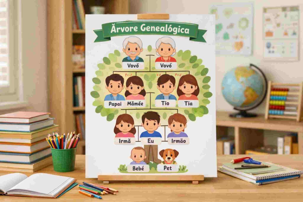 A árvore pode ser feita em papel, cartolina, caderno ou até em formato digital. Para os menores, desenhos e colagens ajudam muito. Já os maiores podem gostar de esquemas com nomes escritos e pequenas informações.