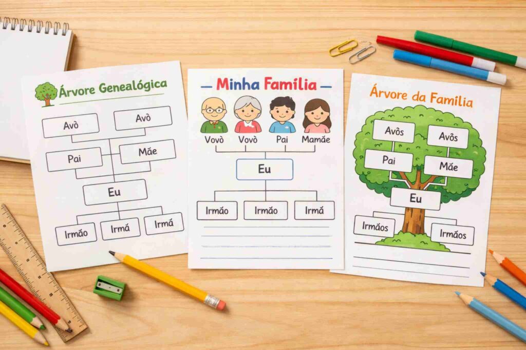 Para atividades escolares, o ideal é usar modelos de árvore genealógica fáceis de entender e rápidos de montar. Quanto mais visual e organizado for o modelo, maior será o envolvimento das crianças.