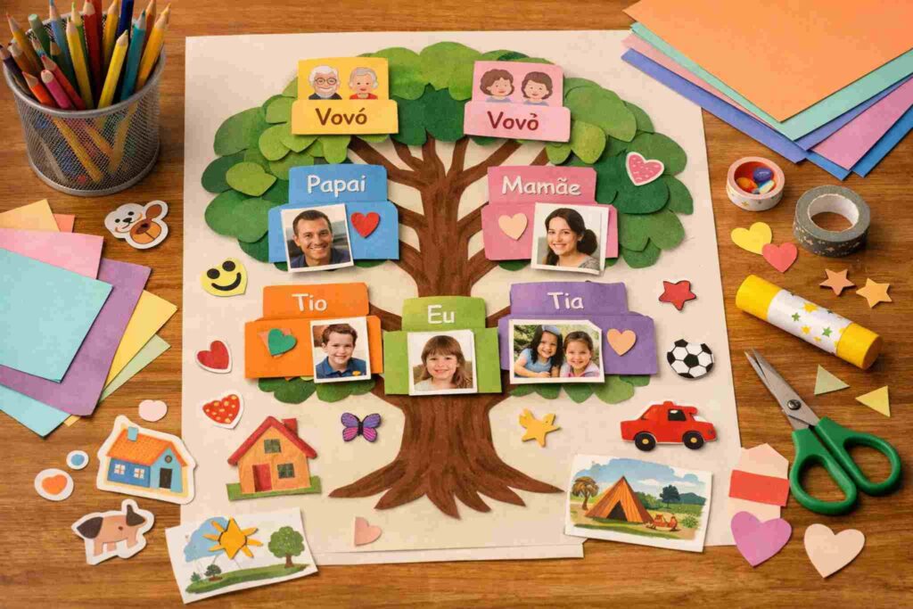 Antes de começar, vale lembrar: a árvore genealógica precisa ser simples, visual e significativa para a criança. A ideia não é decorar nomes, mas entender laços familiares e histórias.