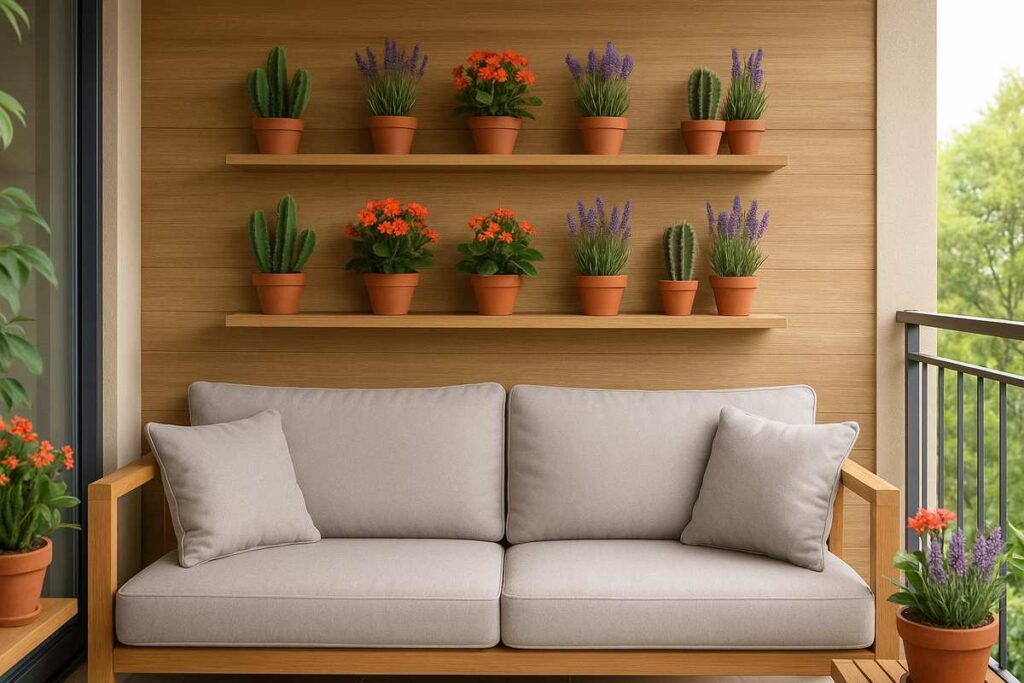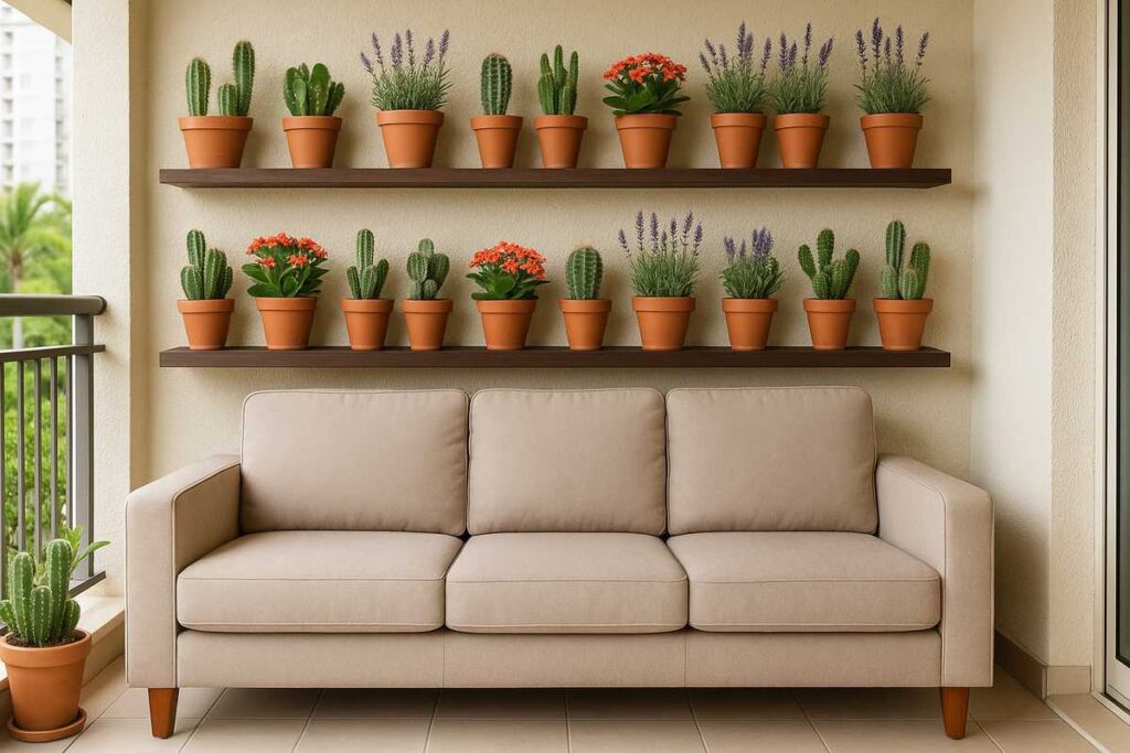 Se sua varanda for compacta, use mesas laterais estreitas ou bancos de apoio ao lado do sofá e posicione vasinhos pequenos com espécies como suculentas, peperômias, jiboias ou mini samambaias. Esses arranjos criam um toque verde delicado sem ocupar muito espaço.