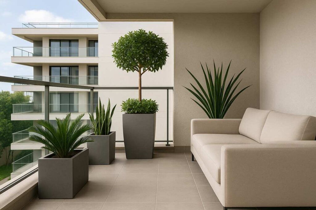 - Em varandas modernas, aposte em vasos com linhas retas, plantas estruturadas e sofás com tecidos neutros