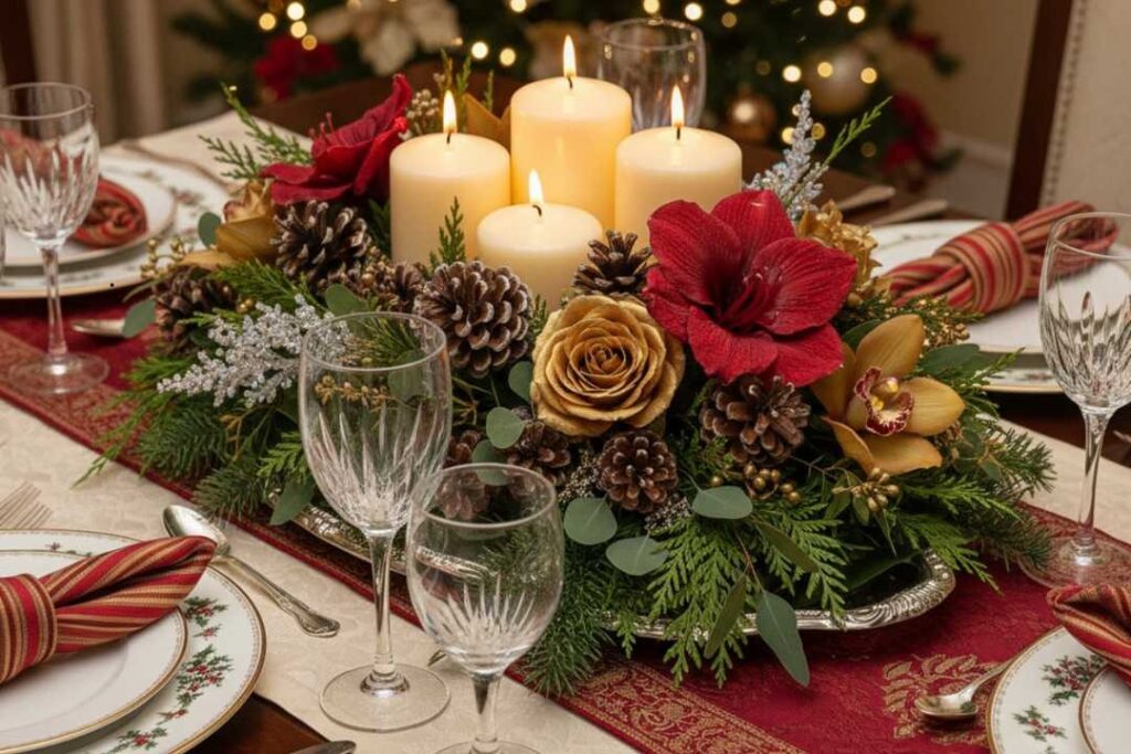 O centro de mesa é o destaque da decoração natalina, trazendo charme e equilíbrio à mesa posta