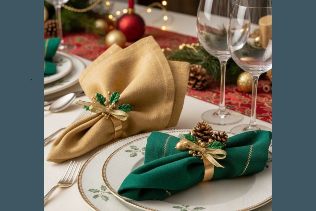 Guardanapos e porta-guardanapos na mesa posta de Natal