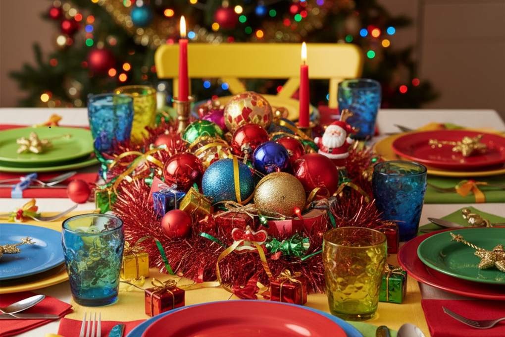 Cores vibrantes e detalhes criativos transformam a mesa de Natal em uma celebração alegre e descontraída
