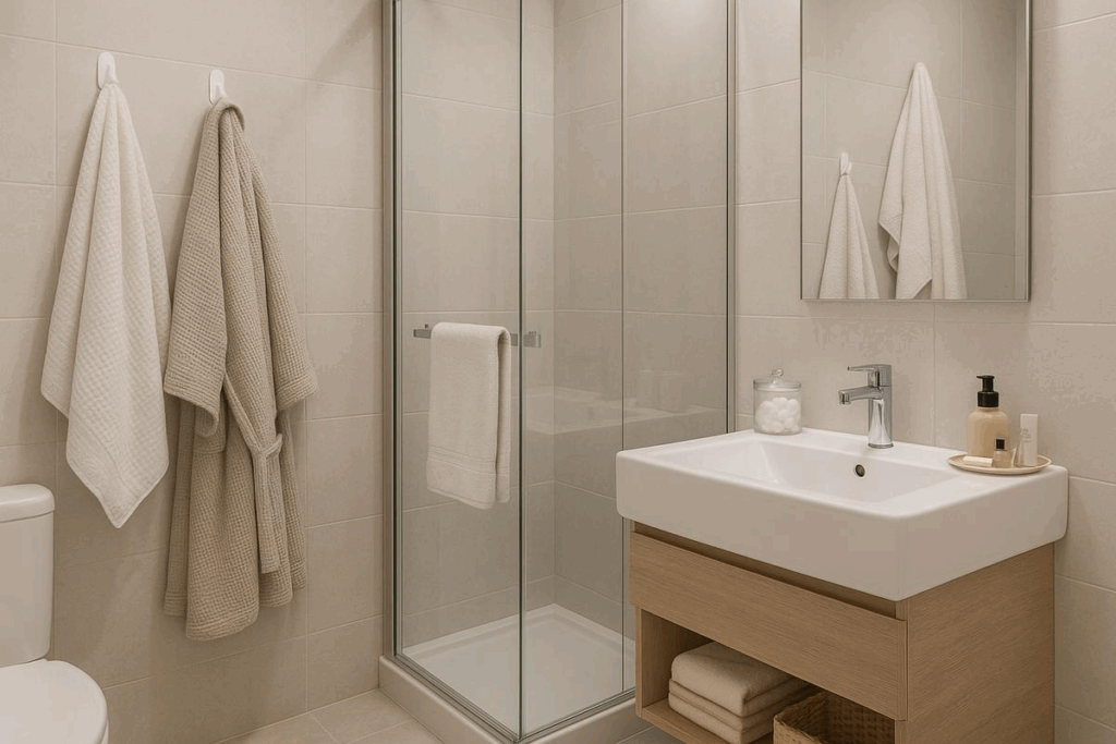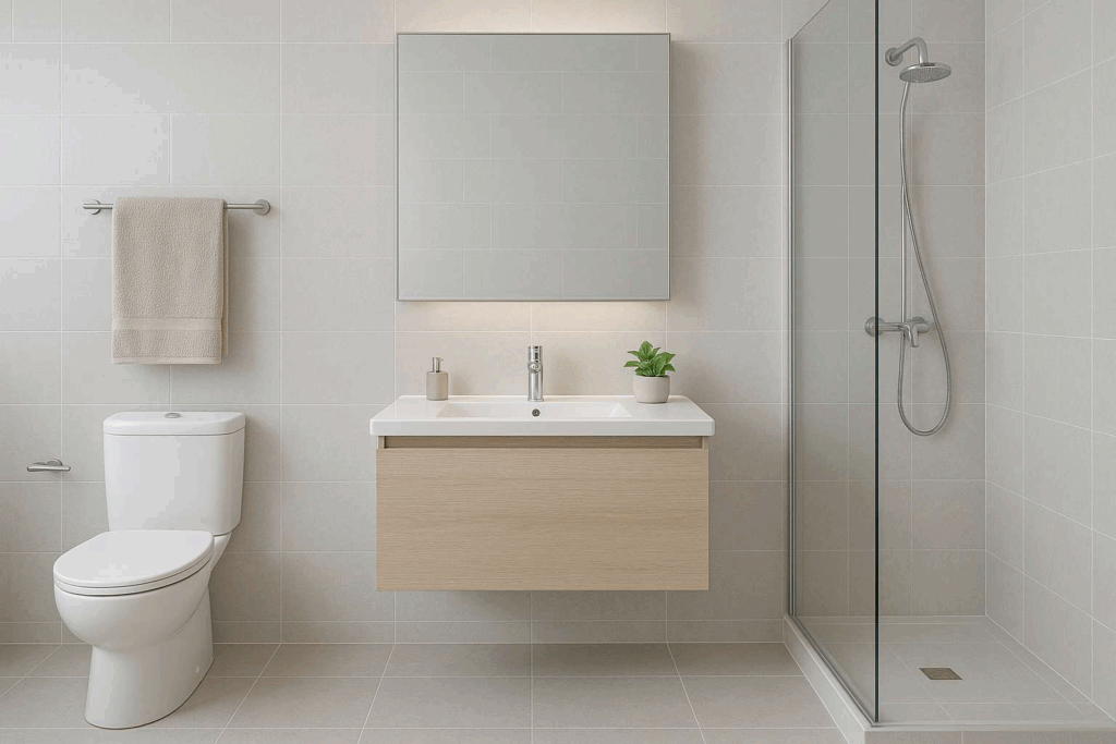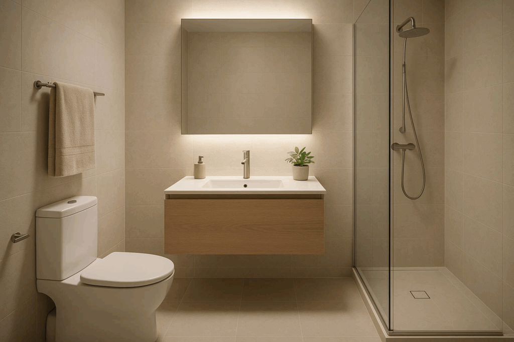 Banheiro moderno e organizado, com design limpo e funcional