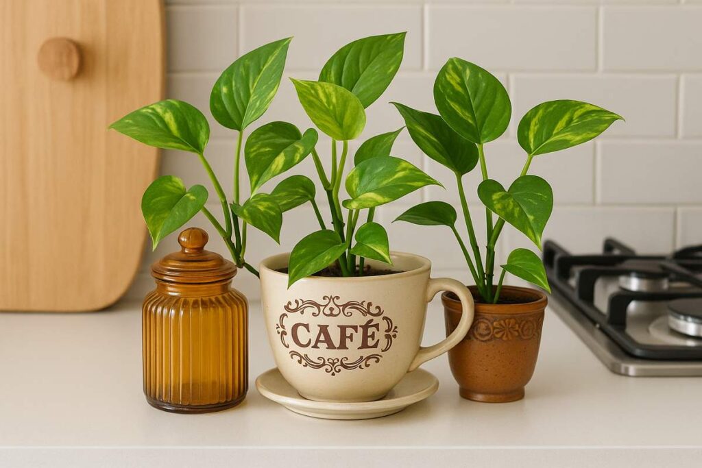 • Vaso no topo da geladeira: Um vaso pequeno com Jibóia no topo da geladeira traz verde para a cozinha de forma criativa e funcional.