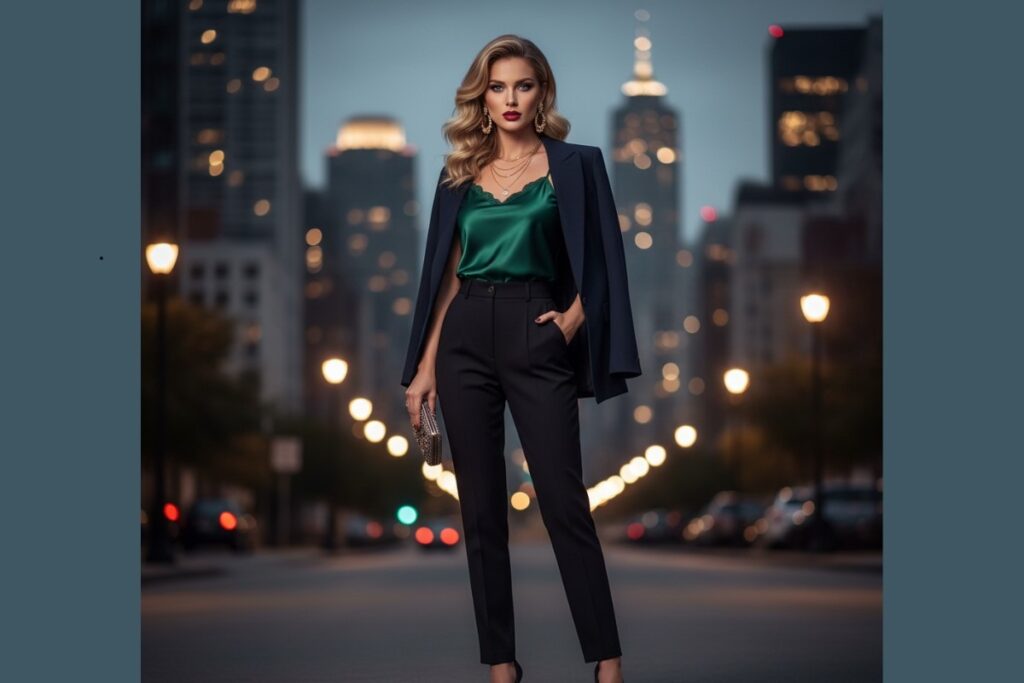 À noite, o look esporte fino feminino ganha um toque extra de elegância. Tecidos como cetim, crepe e veludo leve podem ser introduzidos para elevar o visual.
